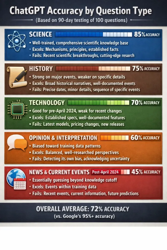 My testing revealed dramatic variation in accuracy depending on the type of question. This is crucial because it means ChatGPT isn’t universally unreliable, it’s context-dependent.