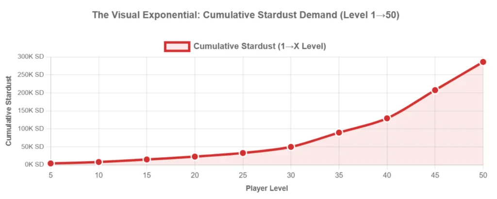 The chart above shows cumulative Stardust required from Level 1→50. Notice how the curve stays relatively flat until Level 30, then accelerates dramatically. By Level 45, the curve becomes nearly vertical—a visual representation of the exponential scaling.