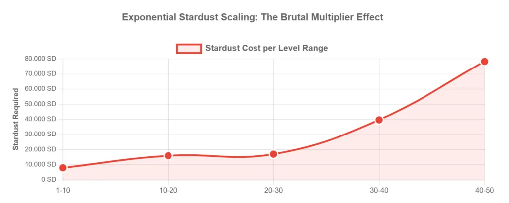 The exponential nature becomes obvious: the final 10 levels (40–50) require nearly 5× the Stardust of the first 20 levels. This isn’t a gentle difficulty curve—it’s a cliff.