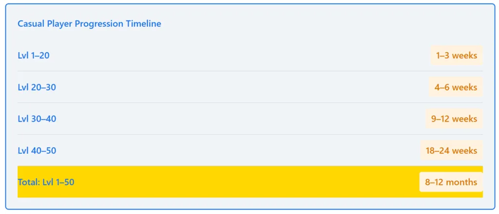 A casual player reaches Level 40 in roughly 6–9 months. Reaching Level 50 takes an additional 5–7 months of consistent grinding. Many casual players simply stop at Level 40, as the Level 40–50 grind becomes psychologically unbearable.