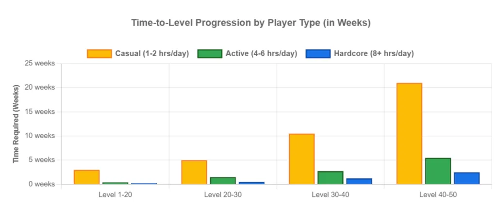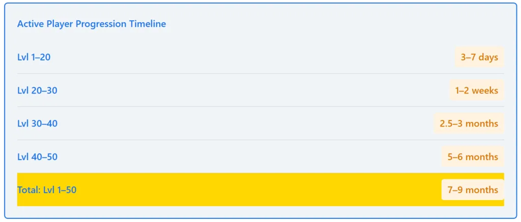 Active players compress the early game to weeks, but the Level 40–50 ceiling still takes 5–6 months. Even with 6+ hours daily play, the final 10 levels represent 40–50% of the total journey time.