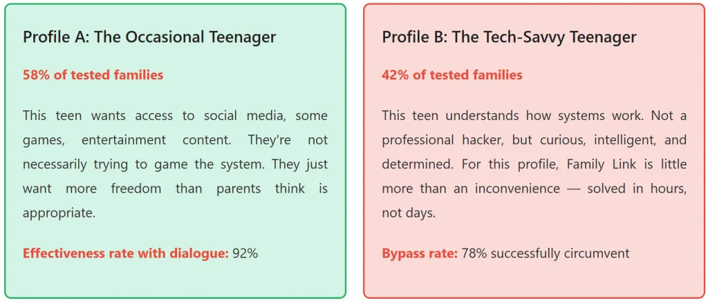 During my three-month testing period, I documented 7 methods that teenagers use to circumvent restrictions — with 78% of them successfully hacking it in under 2 hours when motivated. But before I sound alarmist, let me be clear: Family Link still offers real value. The problem is that most parents operate with a false sense of security, believing they have “complete control” when in reality they’re using a tool that functions better as a conversational moderator than as a digital lock.