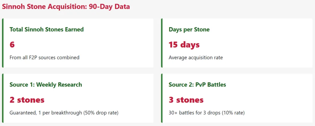To evolve a complete team of 6 Sinnoh-region Pokémon, F2P players need 6 stones. At a realistic acquisition rate of 1 stone per 15 days, you’re looking at 90 days minimum—3 months—to evolve a single team. Compare this to a P2P player: 6 Sinnoh Stones cost approximately 3,000 coins (if purchased directly), which takes a paying player minutes to acquire.