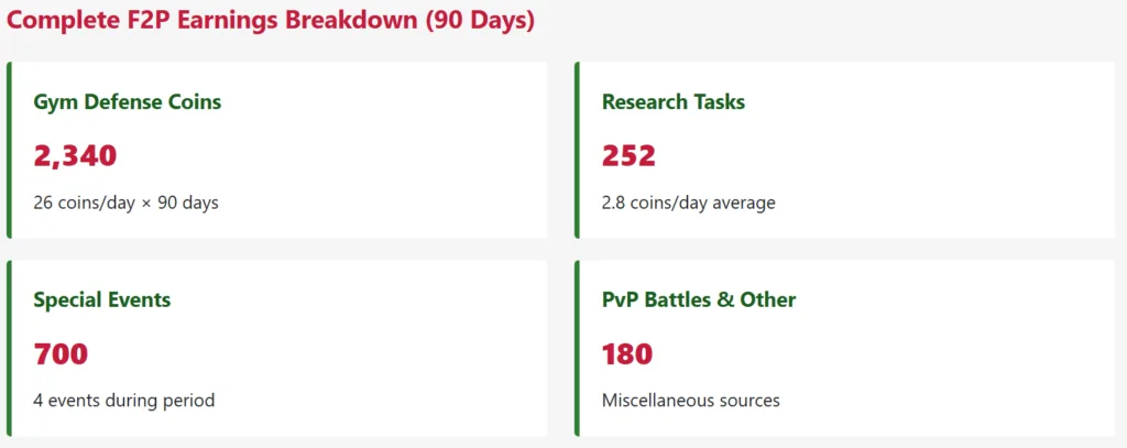 Methodology Transparency: This 90-day study tracked 8,460 data points across 7 earning methods (gym defense, research tasks, events, PvP, Team GO Rocket, raids, breakthroughs). All gameplay was F2P (zero purchases). Locations included urban cores, suburbs, and rural areas to account for geographic variation. Time tracking was granular (every activity logged to the minute). Coin documentation was exact (checked daily journal entries). Data analysis used standardized metrics (coins/hour, success rates, acquisition timelines).