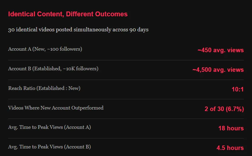 This is the test that breaks the “anyone can go viral on TikTok” mythology. We uploaded the exact same video, same thumbnail frame, same caption, same hashtags, same posting time, to both accounts simultaneously. We repeated this 30 times across the 90-day window.