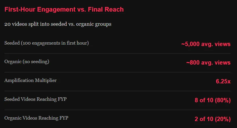 The results were stark. Videos with 100 early engagements averaged 5,000 views — a 6.25x multiplier over their organic counterparts. Eight out of ten seeded videos broke through to the For You Page. Only two organic videos achieved the same.