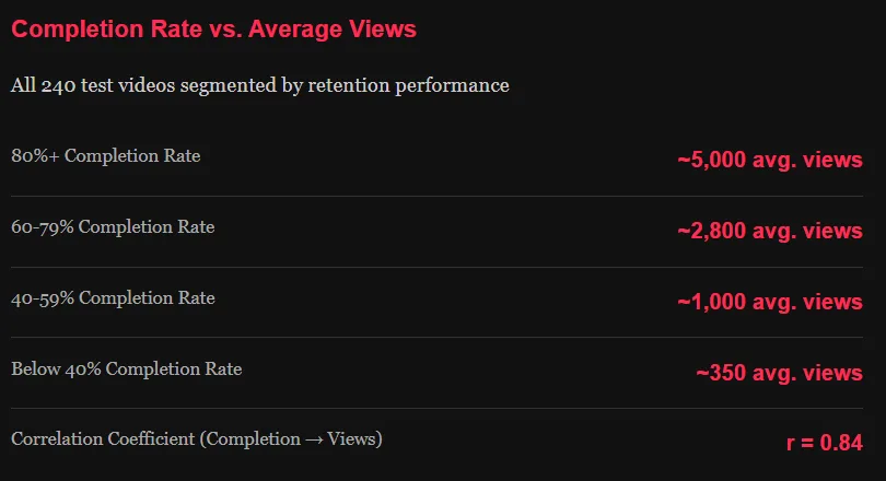 The correlation between completion rate and total views was 0.84, an exceptionally strong positive relationship. Videos maintaining 80% or higher completion earned 14x more views than those dropping below 40%. This finding is consistent with OpusClip’s 2026 algorithm report, which identifies watch time as the “primary algorithm factor” and notes that high-quality creators see “67% more watch time per view” and “40x greater follower growth.”