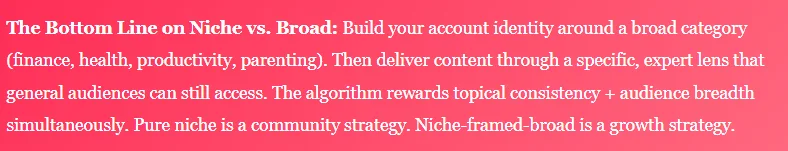 The most successful strategy we identified wasn’t pure niche or pure broad, it was what we call “niche framing of broad topics.” Take a universally interesting subject (money, relationships, health, career) and deliver it through a specific lens that signals expertise without limiting the addressable audience.