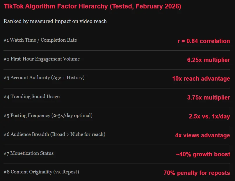 After 90 days, 240 videos, and thousands of data points, here’s the algorithm factor hierarchy as our testing revealed it, ranked by actual impact on video distribution: