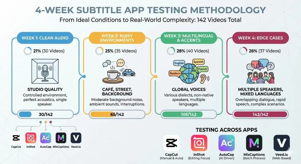 We tested these five apps systematically: CapCut, Veed.io, MixCaptions, AutoCap, and InShot. (We initially planned 10 apps but eliminated five in week one—they were too limited for serious comparison.)