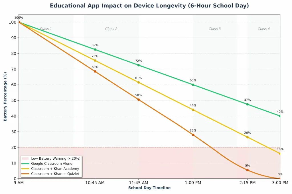 What happens at 2:15 PM: Student attempts to submit a 15-minute online quiz. Chromebook hits 20% battery warning. OS throttles CPU and background services. Quiz timer continues running. Browser performance degrades. Student runs out of time on last question.