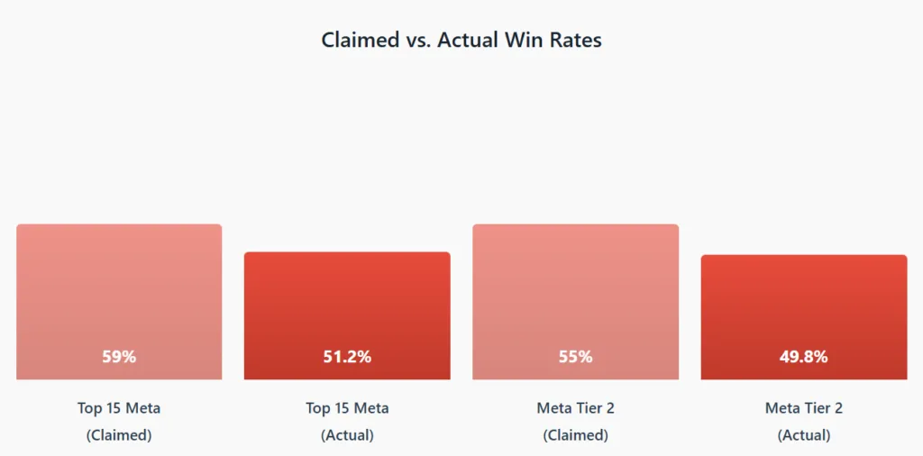 The top 15 “meta” decks claimed 56-62% win rates but achieved only 51.2% in real testing. That’s a -8 percentage point gap—huge in competitive gaming.