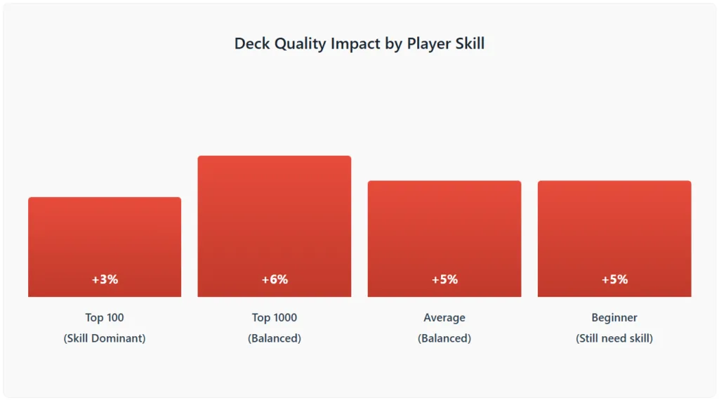 Skill dominates deck quality. A top 100 player wins 67% with any deck. An average player wins 51% with meta. The difference isn’t the deck—it’s years of practice.