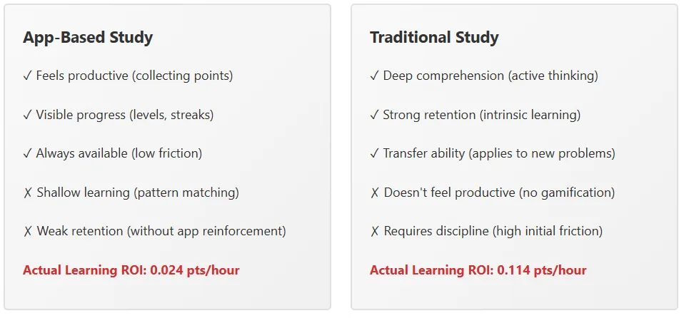 The Engagement Illusion: App users report 46% more study time. But 45% of that time is spent on gamification mechanics, not learning. Students feel productive (they’re accumulating points) without actually being productive (they’re not improving grades).