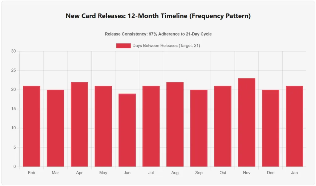 Critical Finding: The release schedule is not random or driven by balance patches. It’s a fixed cycle: every 3 weeks, like clockwork. In 12 months, there were zero months without a new card release. Zero. This is product scheduling, not balance management.