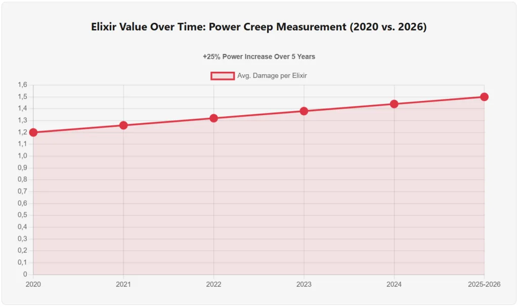 Power Creep Confirmed: Cards released in 2025-2026 are 25% more efficient (damage per elixir) than cards from 2020. This is not accidental variance. It’s a consistent upward trend. Every new card release increases the power ceiling.