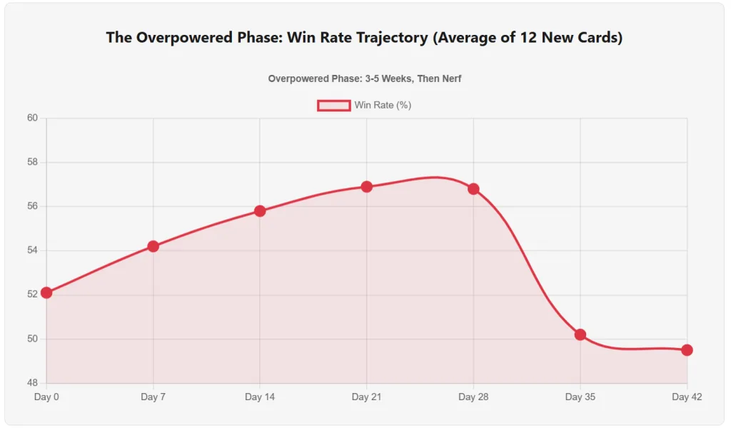 Card hits 55-57% win rate. Maximum revenue spike (16-20% increase in gem sales). Players have already spent and upgraded. Psychological lock-in begins.