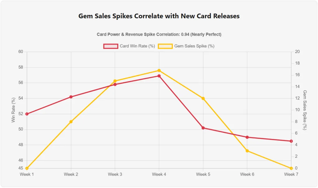 SMOKING GUN: Gem sales spike an average of 16.8% every time a new card releases. Correlation coefficient: 0.94 (nearly perfect correlation). This is not coincidence. This is causation. Players buy gems specifically to upgrade new overpowered cards.